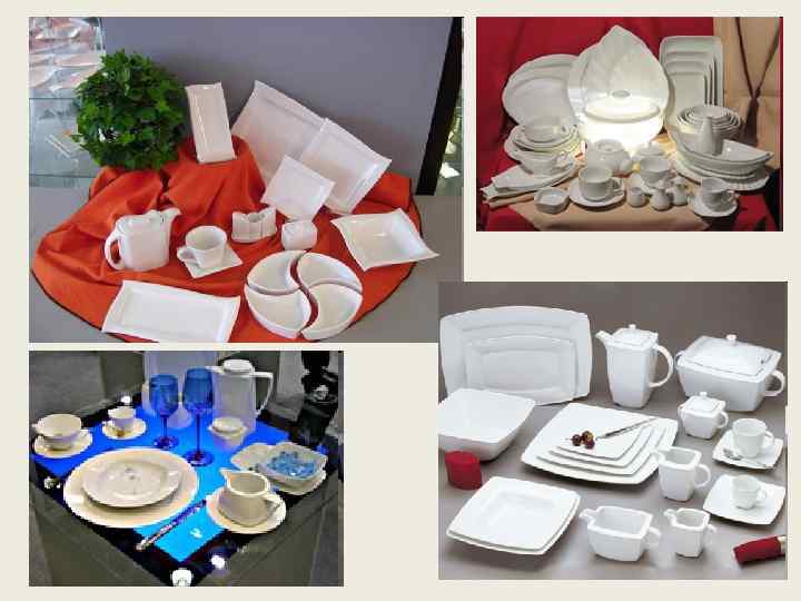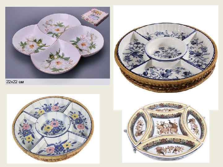 Тарелка глубокая: применяют для подачи первых блюд Блюдо круглое - для мясных и овощных закусок, канапе и заказных блюд; Блюдо овальное - для закусок из рыбной и мясной гастрономии, заказных блюд Бульонная пара: используют для подачи бульонов Ваза для торта