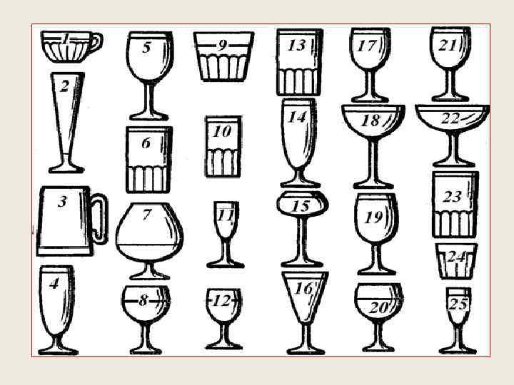 Виды стеклянной посуды 17 бокал для шампанского 18 рюмка для ликера 19 рюмка для мартини 20 рюмка для коктейля 21 бокал для грога 22 бокал для чая или пунша 1 рюмка для ликера 2 бокал для хереса 3 бокал для шампанского 4 бокал для минеральной воды 5 бокал для пива 6 бокал для розового вина 7 бокал для шампанского 8 бокал для бургундского вина 9 рюмка лафитная для красного столового вина 10 рюмка для белого столового вина 11 рюмка рейнвейная (светлозеленая) 12 бокал для десертного вина 13 коньячная рюмка 14 стопка для виски 15 стопка для водки 16 фужер для минеральной или фруктовой воды