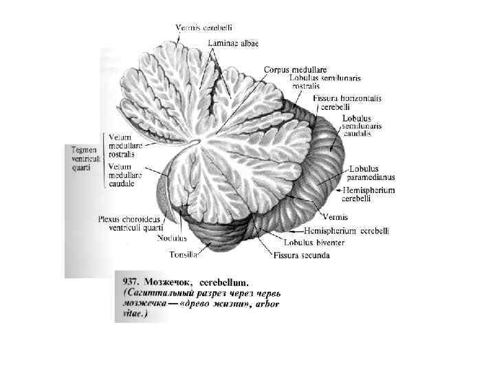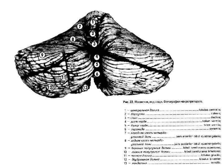 Язычок (Lingula) центральная долька (Lobulus centralis) верхушка (Culmen) скат (Declive) лист червя (Folium vermis) бугор червя (Tuber vermis) пирамида (Pyramis) втулочка (Uvule) узелок (Nodulus)