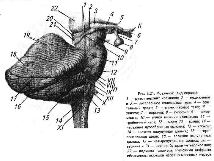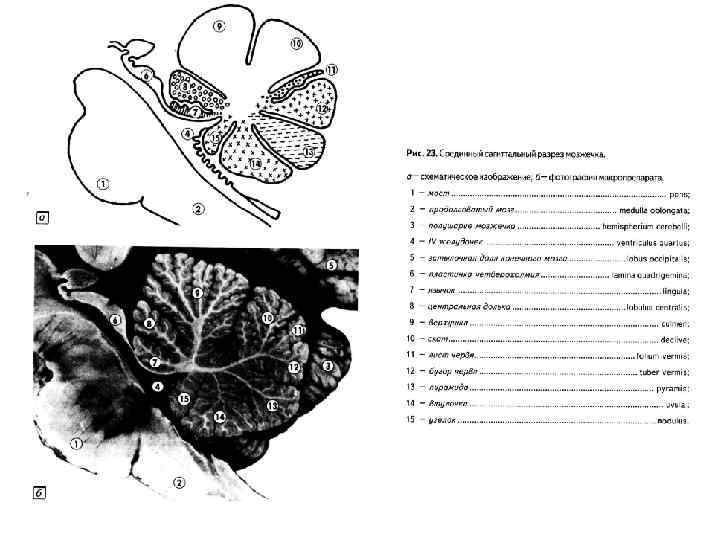 1 – мост, 2 – продолговатый мозг, 3 – полушарие мозжечка, 4 – IV желудочек, 5 – затылочная доля конечного мозга, 6 – пластинка четверохолмия 7 – язычок 8 – центральная долька 9 – верхушка 10 – скат 11 – лист червя 12 – бугор 13 – пирамида 14 – втулочка 15 - узелок