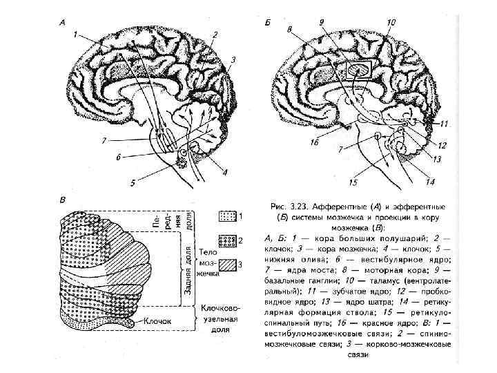 Развитый мозжечок высших млекопитающих состоит из трех частей: древний (paleocerebellum) контролирует вестибулярную функцию (его каудальные отделы); старый (archicerebellum) связан со спинным мозгом (передняя доля) и новый (neocerebellum) — с корой больших полушарий.