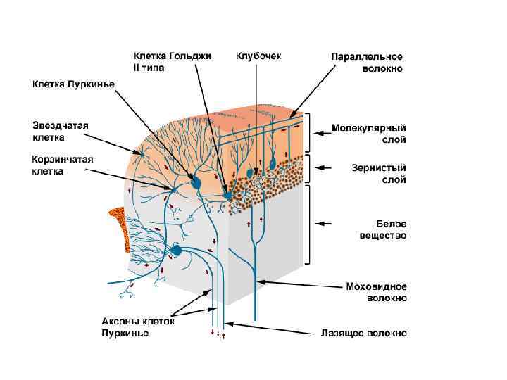 Под молекулярным слоем расположен ганглиозный слой, в котором находятся тела клеток Пуркинье. Третий слой – гранулярный – представлен телами вставочных нейронов (клеток-зерен, или гранулярных клеток). Здесь имеются еще клетки Гольджи, аксоны которых поднимаются в молекулярный слой.
