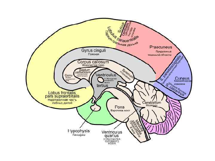 1. Полушарие большого мозга (Конечный мозг) 2. Таламус (Промежуточный мозг) 3. Гипоталамус (Промежуточный мозг) 4. Средний мозг 5. Мост 6. Мозжечок 7. Продолговатый мозг 8. Спинной мозг