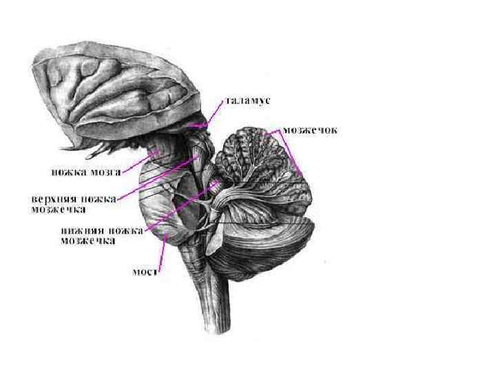 верхняя ножка нижняя ножка 1 — верхняя ножка средняя ножка мозжечка; 2 — средняя ножка мозжечка; 3 — лист (долька мозжечка); 4 — левое полушарие мозжечка; 5 — спинной мозг; 6 — продолговатый мозг; 7 — нижняя ножка мозжечка; 8 — мост; 9 — средний мозг С помощью 3 пар ножек (нижних, средних и верхних) мозжечок связан со стволом мозга. Нижние ножки соединяет мозжечок с продолговатым, средние – с мостом, а верхние со средним и промежуточным мозгом.