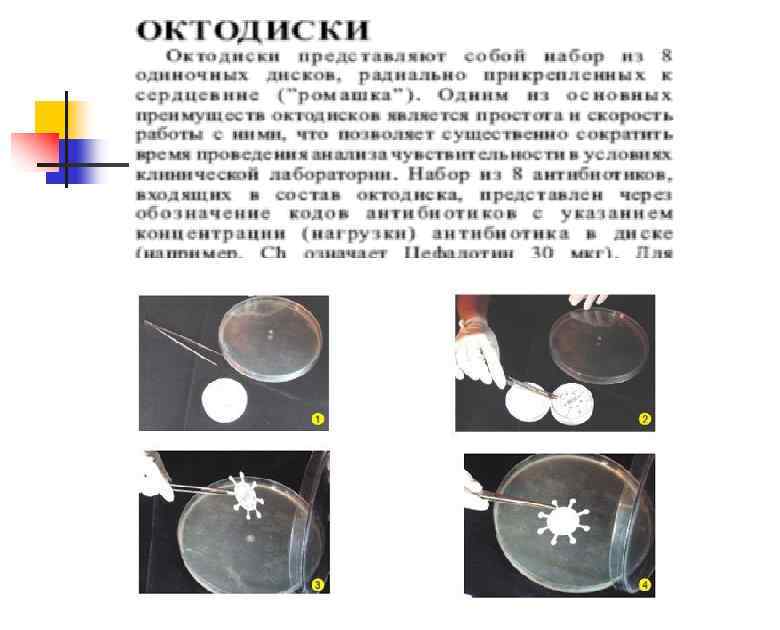 Принцип диско-диффузионного метода определения чувствительности к антибиотикам Бактериальную культуру засевают газоном на питательный агар, после чего на его поверхность пинцетом помещают на равномерном расстоянии друг от друга бумажные диски, содержащие определенные дозы разных антибиотиков. Посевы инкубируют при 37 0 С в течение суток. По диаметру зон задержки роста культуры судят о ее чувствительности к соответствующим антибиотикам. При зоне задержки роста до 15 мм культура расценивается как нечувствительная или низко чувствительная, 15 – 24 мм – средняя чувствительность, 25 мм и более – высокочувствительная.