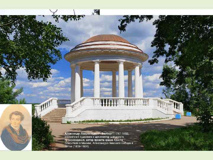 Александровский сад был заложен по случаю посещения Вятки императором Александром I в 1825 г. В 1838 году композиция сада была завершена с возведением входного портика и чугунной ограды, спроектированых ссыльным архитектором Александром Лаврентьевичем Витбергом. Ансамбль Александровского сада включает в себя: входной портик, чугунную ограду и ворота (1838 -1840 гг. , архитектор А. Л. Витберг), центральный павильон (1835 г. , архитектор А. Е. Тимофеев) и береговую ротонду (1835 г. , архитектор А. Е. Тимофеев). Александровский сад в 1960 г. объединен с Заречным парком и получил название Центральный парк культуры и отдыхи имени Степана Халтурина. В наши дни парку возвращено первоначальное название - Александровский сад. Александр Лаврентьевич Витберг (1787 -1855) – российский художник и архитектор шведского происхождения, автор проекта храма Христа Спасителя в Москве, Александро -Невского собора в Вятке (1839 -1864).