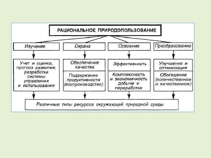 Природно-ресурсный потенциал – часть природных ресурсов, которая реально может быть вовлечена в хозяйственную деятельность при данных технических и социально-экономических возможностях общества, при условии сохранения среды жизни человека. Природопользование – совокупность всех форм эксплуатации природно-ресурсного потенциала и мер по его сохранению. Рациональное природопользование: • не приводит к резкому изменению природно-ресурсного потенциала; • человек находит разумное сочетание роста воздействия на природу с заботой о ней, с охраной и воспроизводством природных условий и ресурсов.