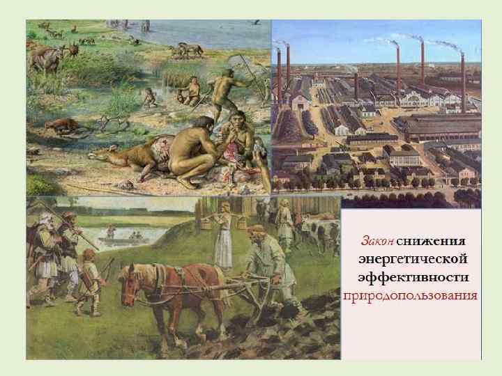 Закон снижения энергетической эффективности природопользования: с ходом исторического времени при получении из природных систем полезной продукции на ее единицу затрачивается все больше энергии, а энергетические расходы на жизнь одного человека возрастают. Так, на одного человека в каменном веке расход энергии (ккал/сут. ) равен 4 тыс. , в аграрном обществе – 12 тыс. , в индустриальную эпоху – 70 тыс. , а в передовых развитых странах конца XX в. – 230 -250 тыс. , в 58 -62 раза больше, чем у наших далеких предков.