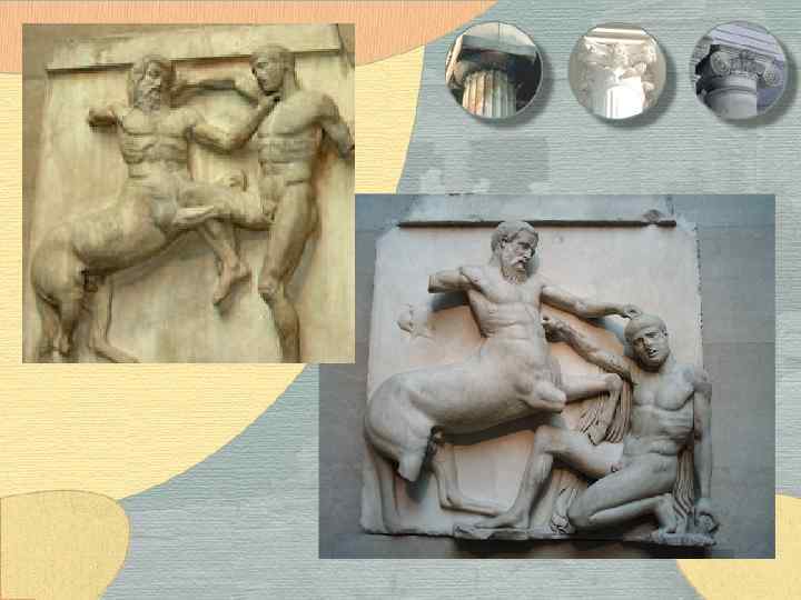 Во фронтонах располагались скульптурные группы, изображавшие наиболее значимые в культе Афины события ее рождение и спор с морским богом Посейдоном за обладание Аттикой.