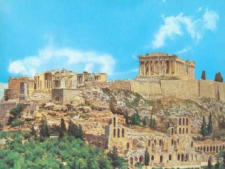 Афинский Акрополь, представляющий собой 156 метровый скалистый холм с пологой вершиной (ок. 300 м в длину и 170 м в ширину), место древнейшего поселения в Аттике.