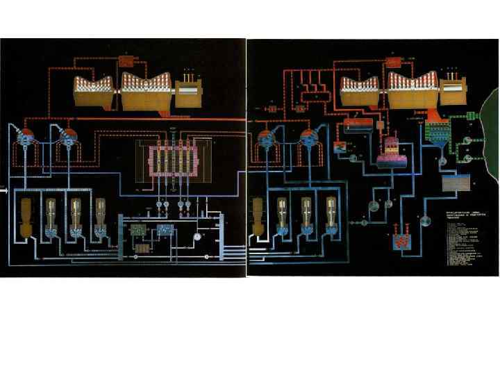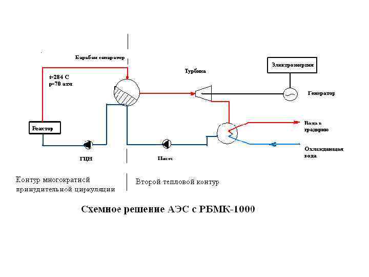 3. Технологическая схема энергоблока В одноконтурном канальном энергетическом уранграфитовом реакторе вода при прохождении через активную зону нагревается до температуры кипения. В верхней части активной зоны образуется пар (именно кипение воды в активной зоне реактора принципиально отличает РБМК от ВВЭР). Пароводная смесь поступает в сепаратор, где делится на воду, возвращающуюся на вход реактора, и пар, идущий непосредственно на турбину. Конденсат пара из конденсатора турбины направляют через подогреватели низкого давления в деаэратор, а затем в реактор. Неконденсирующиеся газы из конденсатора турбины выбрасывают в систему специальной вентиляции или на очистку.