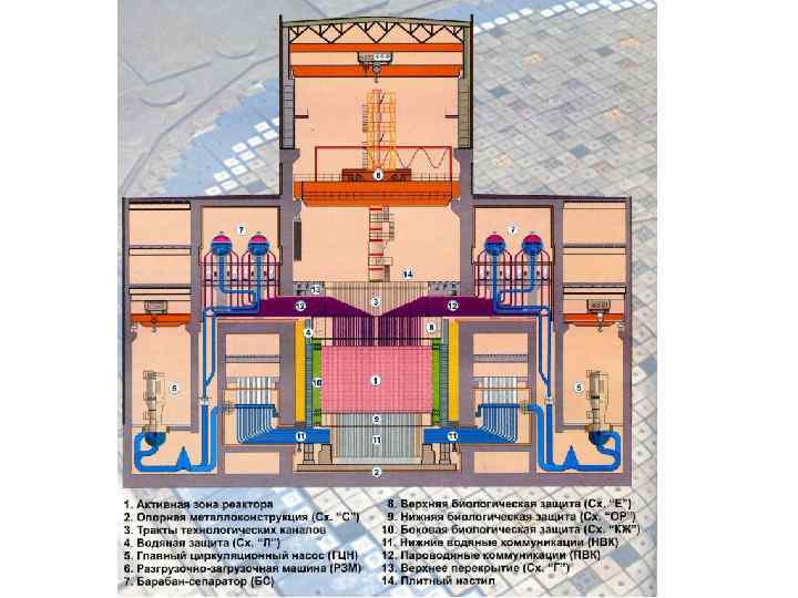 1. Конструкция РБМК Канальные кипящие реакторы типа РБМК состоят из цилиндрической графитовой кладки замедлителя, размещаемой в бетонной шахте, через которую проходят специальные каналы для органов регулирования и технологические каналы с урановым топливом, охлаждаемым водой. Проходя через технологические каналы, вода сначала подогревается, а затем частично испаряется. Пароводяная смесь по индивидуальным трубопроводам направляется в барабан - сепаратор, где пар осушается, а затем транспортируется в турбину. Конденсат пара смешивается с теплоносителем из барабан - сепаратора и циркуляционным насосом возвращается в реактор.