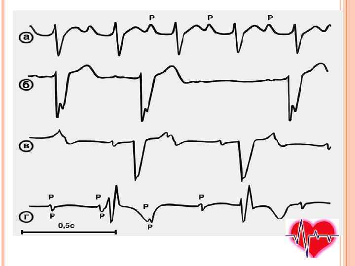 ЭКГ- ПРИЗНАКИ АТРИОВЕНТРИКУЛЯРНОЙ БЛОКАДЫ а — блокада I степени; интервал Р—Q до 0, 28 с; б — блокада II степени, тип Мобитц I; феномен Венкебаха; удлинение Р—Q в двух первых комплексах от 0, 24 до 0, 27 с, после третьего зубца Р комплекс QRST выпадает; в — блокада II степени, тип Мобитц II; комплекс QRST отсутствует после каждой второй волны Р (блокада 2: 1); г —блокада III степени: полная диссоциация предсердных и желудочковых комплексов; интервалы Р —Р — 0, 52 с (частота возбуждения предсердий 116 в 1 мин), R—R — 1, 32 с (идиовентрикулярный ритм — 45 в 1 мин).