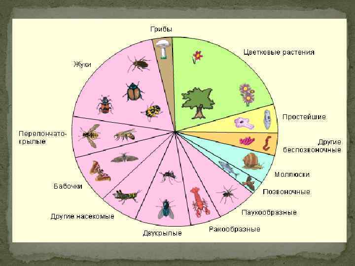Таблица 1. Приблизительное число видов в группах животных(всего в животном мире около 1, 5 млн. видов) Группа организмов Одноклеточные Кишечнополостные Губки Плоские черви Круглые черви Кольчатые черви Плеченогие Моллюски Иглокожие Оболочники Членистоногие: ракообразные Число видов более 263 000 более 9 000 5 000 13 000 10 333 9 000 280 110 000 600 1 100 1 066 000 20 000 Группа организмов паукообразные многоножки насекомые Хордовые: ланцетники круглоротые рыбы земноводные пресмыкающиеся птицы млекопитающие Число видов 35 000 11 000 000 42 400 28 Более 40 20 000 2 100 6 000 8 600 4 500