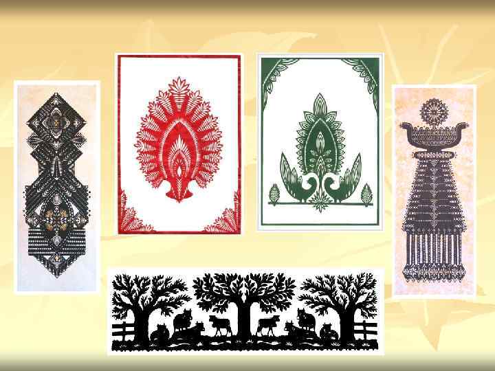 Основные черты выцинанки n n Зеркальная симметрия Складывание бумаги в несколько раз Относительная монохромность Создание изображения из прорезей простых геометрических форм