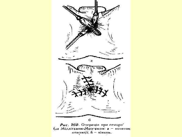 Діагностика 1. Огляд ануса при натужуванні 2. Пальцеве дослідження прямої кишки 3. Дослідження за допомогою прямокишкового дзеркала 4. Ректороманоскопія Принципи лікування 1. Консервативне лікування: сидячі ванни зі слабким р – ном перманганату калію, кори дуба, ромашки; невеликі клізми 2 -3 р/д; мікроклізми з риб'ячим жиром; дієта; послаблюючі засоби, лікувальна гімнастика; при болях – свічки з анестезином; профілактика гемокоагуляції – трентал, ескузан, нормовен. 2. При наявності тромбофлебіту – антикоагулянти, ліжковий режим, обезболюючі. 3. При запальних процесах – Протизапальна терапія, АБ 4. При кровотечах, випадіннях, тріщинах, парапроктиті – оперативне втручання.