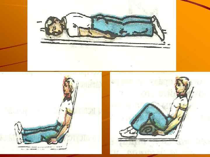 Положение пострадавших при транспортировке При ранении головы, позвоночника или конечностей, пострадавший в сознании