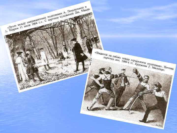 Из истории дуэлей. • С древнейших времен (в древнегреческих • • мифах – поединок Париса и Менелая). Особенно широкое распространение в средние века (рыцарские поединки). С 15 века в Испании, Италии, Франции, а затем и в других европейских странах возникает дуэль как поединок с целью удовлетворения (сатисфакции) за нанесенную обиду или оскорбление чести.