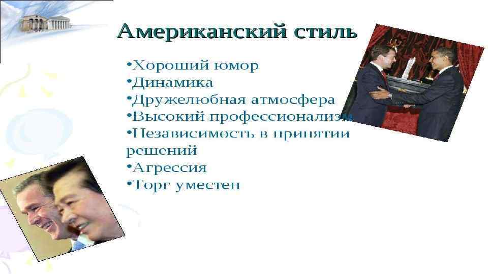 ВЕДЕНИЕ ПЕРЕГОВОРОВ На переговорах они сосредотачиваются именно на том вопросе, который необходимо решить. Американцы уделяют внимание не только самой собственно проблеме, но и ее деталям, обсуждают пути решения. Поэтому они серьезно относятся к различным совещаниям и переговорам и в ходе них стараются обсудить множество предложений.