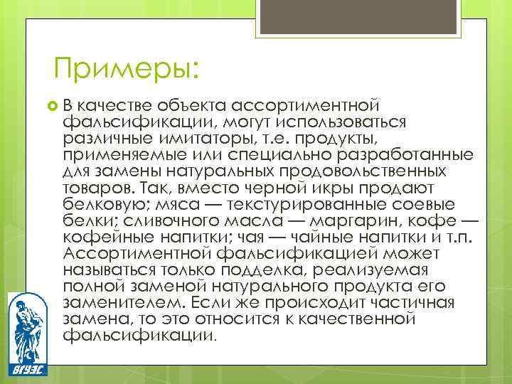 Примеры: В качестве объекта ассортиментной фальсификации, могут использоваться различные имитаторы, т. е. продукты, применяемые или специально разработанные для замены натуральных продовольственных товаров. Так, вместо черной икры продают белковую; мяса — текстурированные соевые белки; сливочного масла — маргарин, кофе — кофейные напитки; чая — чайные напитки и т. п. Ассортиментной фальсификацией может называться только подделка, реализуемая полной заменой натурального продукта его заменителем. Если же происходит частичная замена, то это относится к качественной фальсификации.