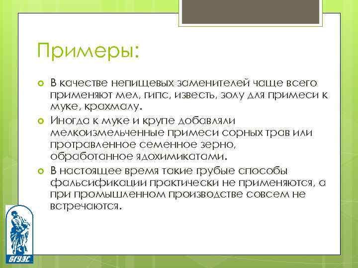 Примеры: В качестве непищевых заменителей чаще всего применяют мел, гипс, известь, золу для примеси к муке, крахмалу. Иногда к муке и крупе добавляли мелкоизмельченные примеси сорных трав или протравленное семенное зерно, обработанное ядохимикатами. В настоящее время такие грубые способы фальсификации практически не применяются, а при промышленном производстве совсем не встречаются.