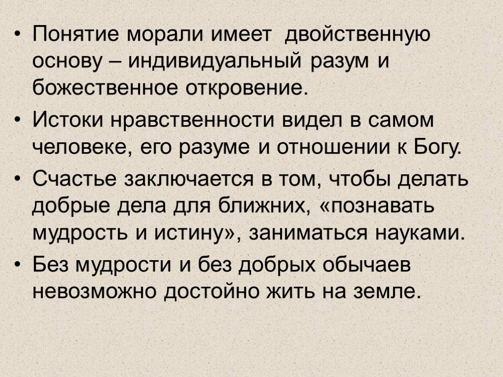 Понятие морали имеет двойственную основу – индивидуальный разум и божественное откровение. Истоки нравственности видел в самом человеке, его разуме и отношении к Богу. Счастье заключается в том, чтобы делать добрые дела для ближних, «познавать мудрость и истину», заниматься науками. Без мудрости и без добрых обычаев невозможно достойно жить на земле.