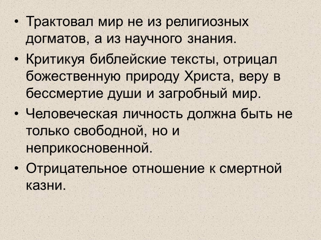 Трактовал мир не из религиозных догматов, а из научного знания. Критикуя библейские тексты, отрицал божественную природу Христа, веру в бессмертие души и загробный мир. Человеческая личность должна быть не только свободной, но и неприкосновенной. Отрицательное отношение к смертной казни.