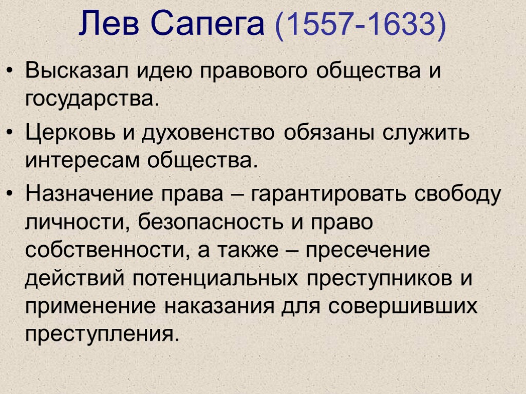 Лев Сапега (1557-1633) Высказал идею правового общества и государства. Церковь и духовенство обязаны служить интересам общества. Назначение права – гарантировать свободу личности, безопасность и право собственности, а также – пресечение действий потенциальных преступников и применение наказания для совершивших преступления.