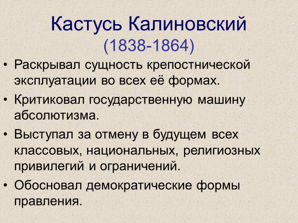 Кастусь Калиновский (1838-1864) Раскрывал сущность крепостнической эксплуатации во всех её формах. Критиковал государственную машину абсолютизма. Выступал за отмену в будущем всех классовых, национальных, религиозных привилегий и ограничений. Обосновал демократические формы правления.