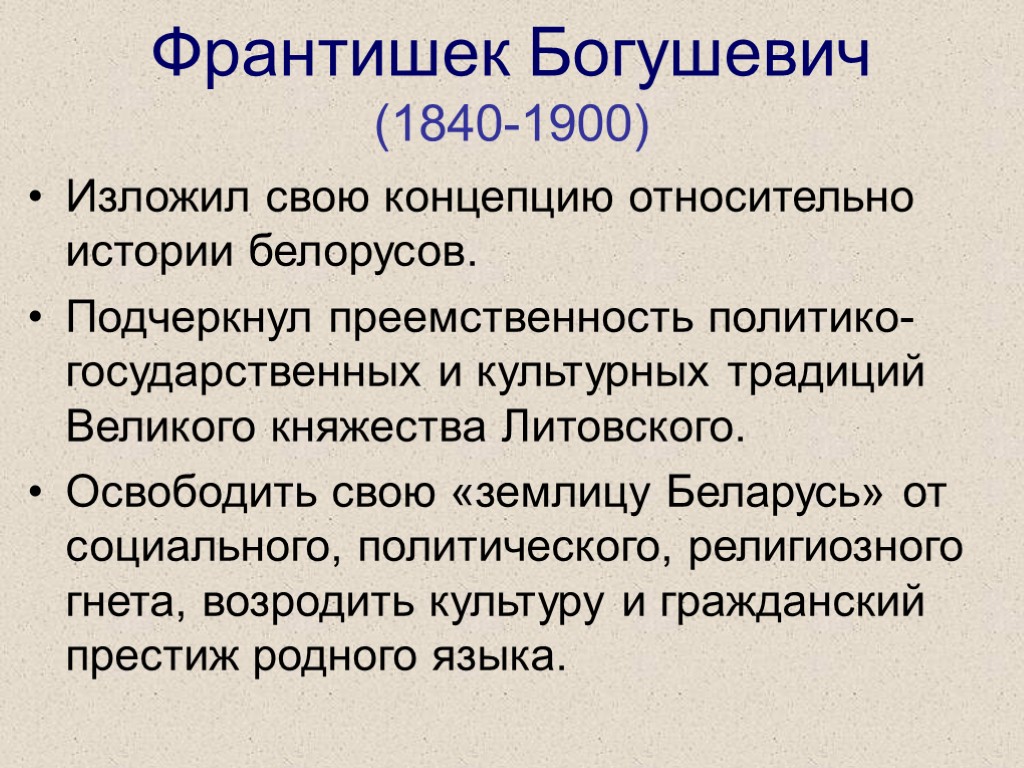 Франтишек Богушевич (1840-1900) Изложил свою концепцию относительно истории белорусов. Подчеркнул преемственность политико-государственных и культурных традиций Великого княжества Литовского. Освободить свою «землицу Беларусь» от социального, политического, религиозного гнета, возродить культуру и гражданский престиж родного языка.