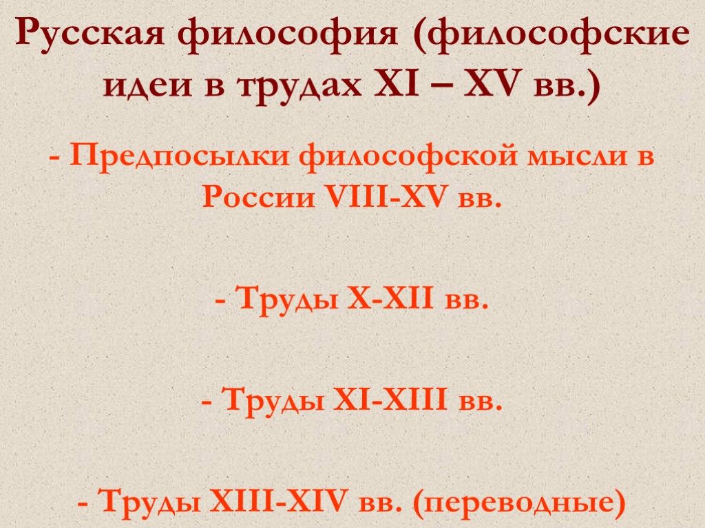 Русская философия (философские идеи в трудах XI – XV вв.) - Предпосылки философской мысли в России VIII-XV вв. - Труды X-XII вв. - Труды XI-XIII вв. - Труды XIII-XIV вв. (переводные)