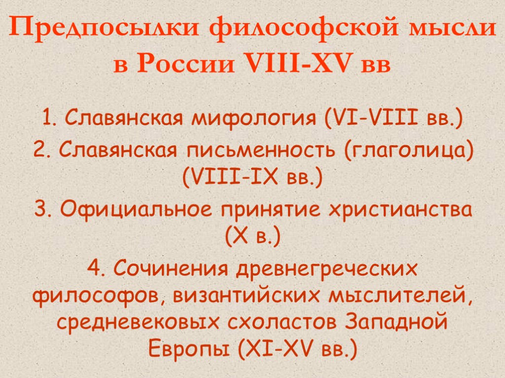 Предпосылки философской мысли в России VIII-XV вв Славянская мифология (VI-VIII вв.) 2. Славянская письменность (глаголица) (VIII-IX вв.) 3. Официальное принятие христианства (X в.) 4. Сочинения древнегреческих философов, византийских мыслителей, средневековых схоластов Западной Европы (XI-XV вв.)