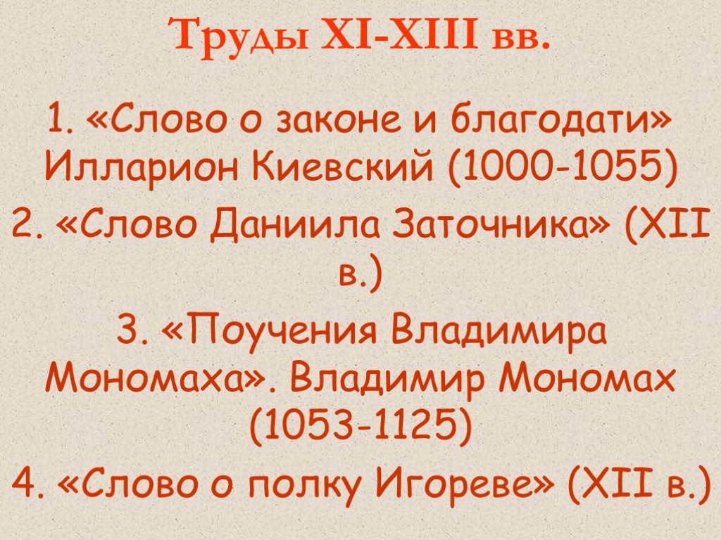 Труды XI-XIII вв. «Слово о законе и благодати» Илларион Киевский (1000-1055) «Слово Даниила Заточника» (XII в.) 3. «Поучения Владимира Мономаха». Владимир Мономах (1053-1125) 4. «Слово о полку Игореве» (XII в.)