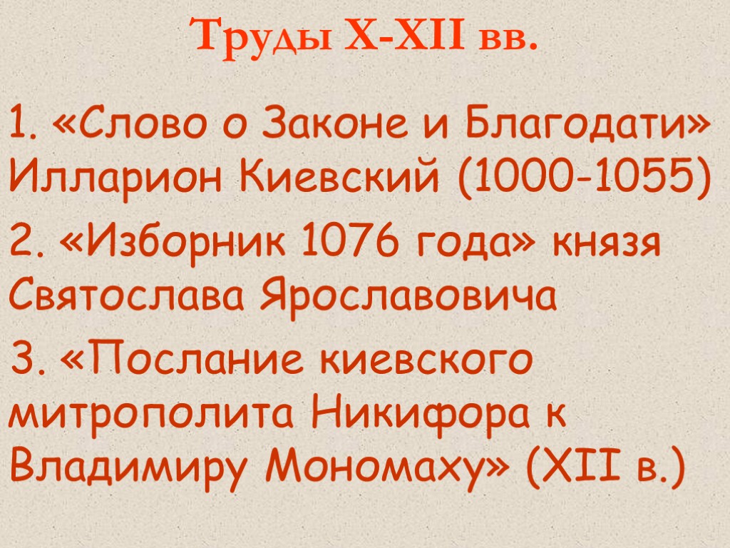 Труды X-XII вв. «Слово о Законе и Благодати» Илларион Киевский (1000-1055) «Изборник 1076 года» князя Святослава Ярославовича 3. «Послание киевского митрополита Никифора к Владимиру Мономаху» (XII в.)
