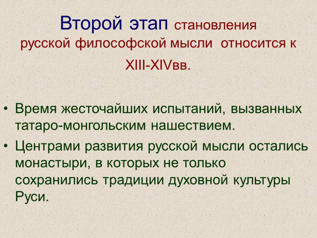 Второй этап становления русской философской мысли относится к ХIII-ХIVвв. Время жесточайших испытаний, вызванных татаро-монгольским нашествием. Центрами развития русской мысли остались монастыри, в которых не только сохранились традиции духовной культуры Руси.