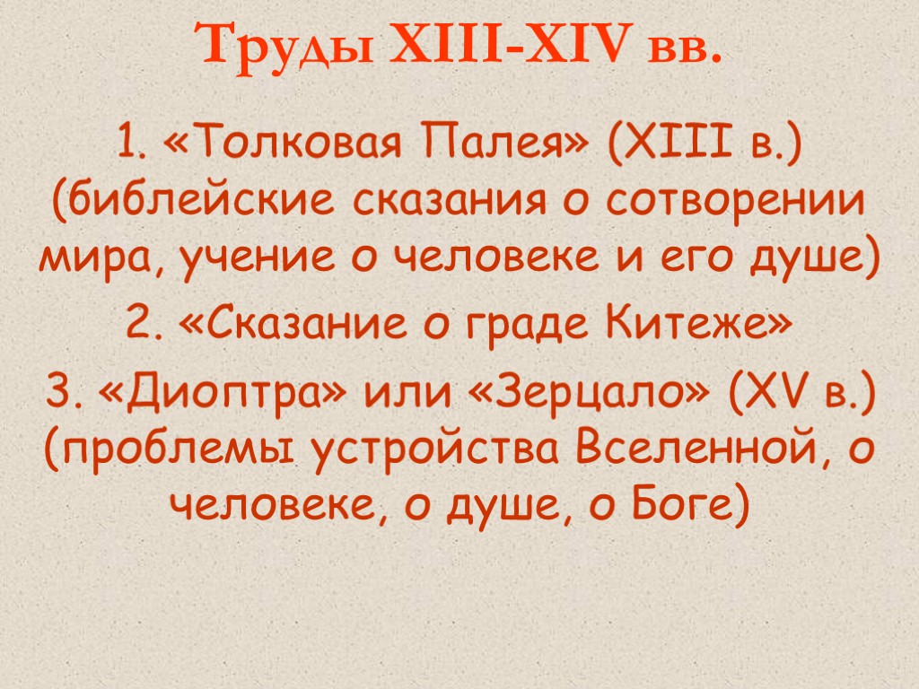 Труды XIII-XIV вв. «Толковая Палея» (XIII в.) (библейские сказания о сотворении мира, учение о человеке и его душе) «Сказание о граде Китеже» 3. «Диоптра» или «Зерцало» (XV в.) (проблемы устройства Вселенной, о человеке, о душе, о Боге)