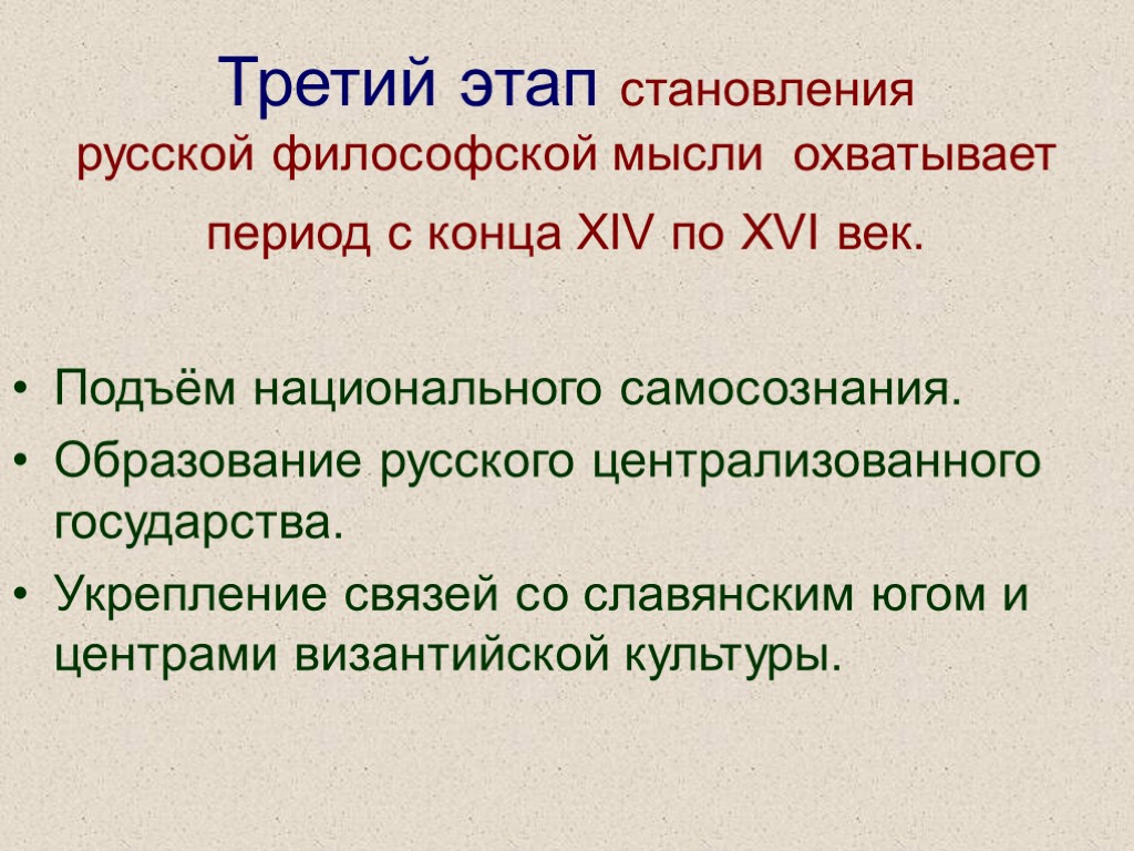 Третий этап становления русской философской мысли охватывает период с конца ХIV по XVI век. Подъём национального самосознания. Образование русского централизованного государства. Укрепление связей со славянским югом и центрами византийской культуры.