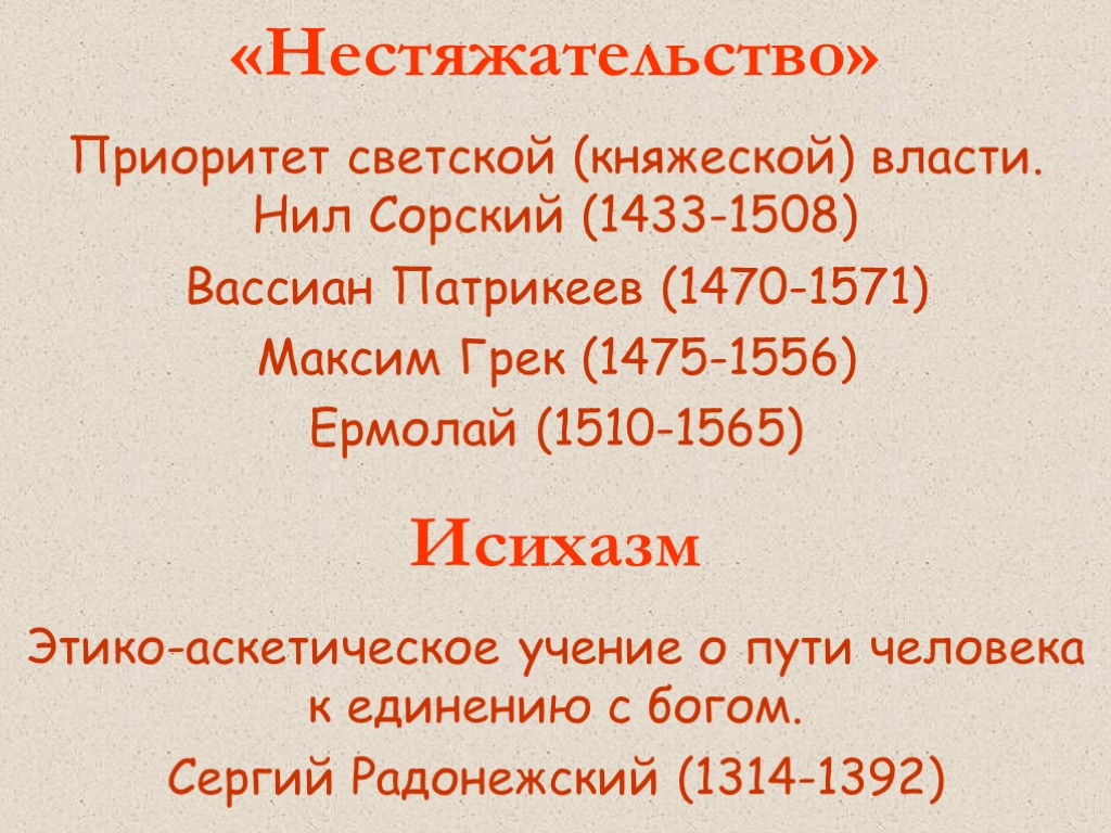 «Нестяжательство» Приоритет светской (княжеской) власти. Нил Сорский (1433-1508) Вассиан Патрикеев (1470-1571) Максим Грек (1475-1556) Ермолай (1510-1565) Исихазм Этико-аскетическое учение о пути человека к единению с богом. Сергий Радонежский (1314-1392)