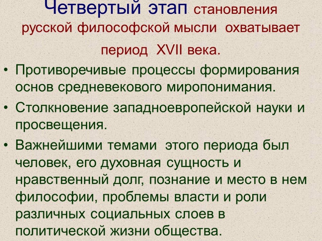 Четвертый этап становления русской философской мысли охватывает период XVII века. Противоречивые процессы формирования основ средневекового миропонимания. Столкновение западноевропейской науки и просвещения. Важнейшими темами этого периода был человек, его духовная сущность и нравственный долг, познание и место в нем философии, проблемы власти и роли различных социальных слоев в политической жизни общества.