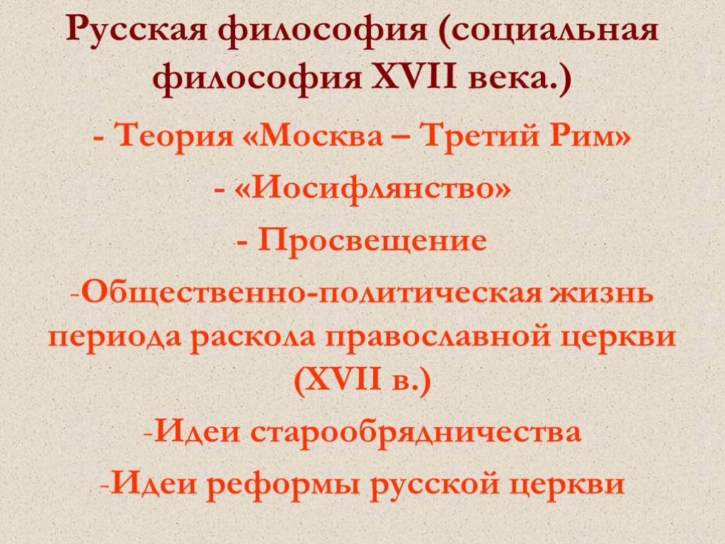 Русская философия (социальная философия XVII века.) - Теория «Москва – Третий Рим» - «Иосифлянство» - Просвещение Общественно-политическая жизнь периода раскола православной церкви (XVII в.) Идеи старообрядничества Идеи реформы русской церкви