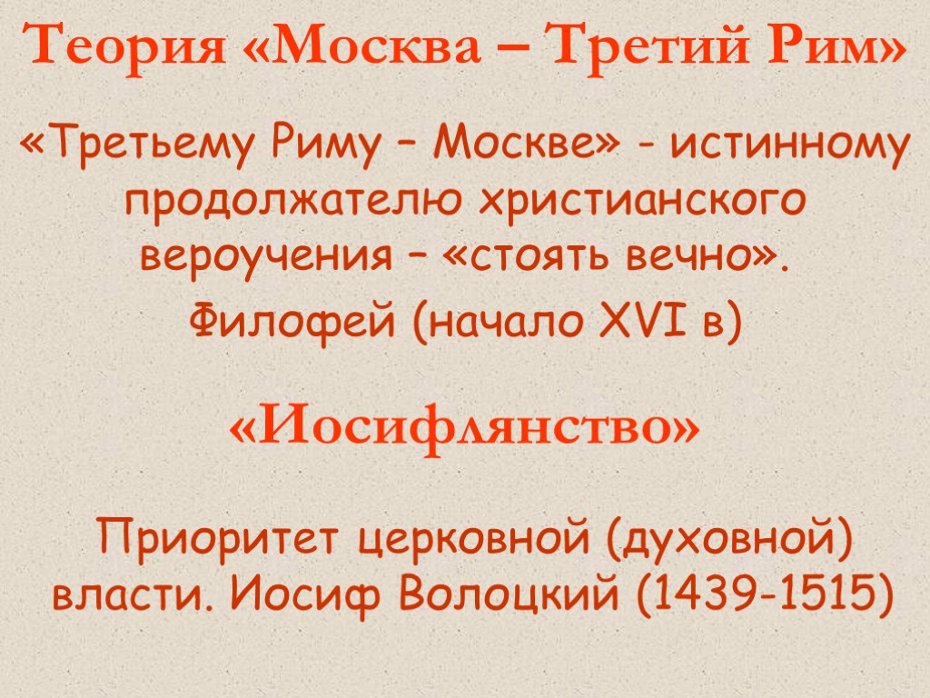 Теория «Москва – Третий Рим» «Третьему Риму – Москве» - истинному продолжателю христианского вероучения – «стоять вечно». Филофей (начало XVI в) «Иосифлянство» Приоритет церковной (духовной) власти. Иосиф Волоцкий (1439-1515)
