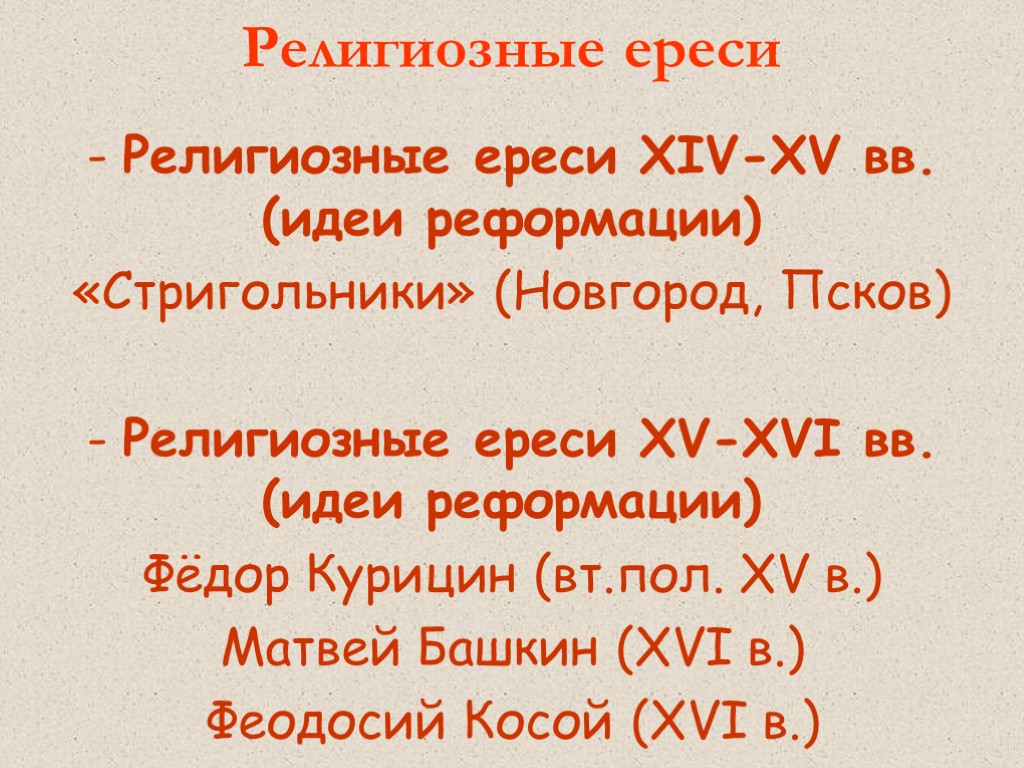 Религиозные ереси - Религиозные ереси XIV-XV вв. (идеи реформации) «Стригольники» (Новгород, Псков) - Религиозные ереси XV-XVI вв. (идеи реформации) Фёдор Курицин (вт.пол. XV в.) Матвей Башкин (XVI в.) Феодосий Косой (XVI в.)