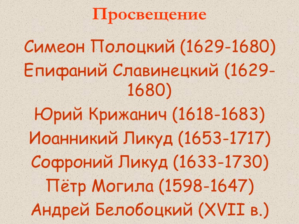 Просвещение Симеон Полоцкий (1629-1680) Епифаний Славинецкий (1629-1680) Юрий Крижанич (1618-1683) Иоанникий Ликуд (1653-1717) Софроний Ликуд (1633-1730) Пётр Могила (1598-1647) Андрей Белобоцкий (XVII в.)