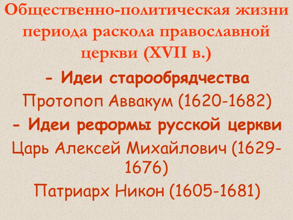 Общественно-политическая жизни периода раскола православной церкви (XVII в.) - Идеи старообрядчества Протопоп Аввакум (1620-1682) - Идеи реформы русской церкви Царь Алексей Михайлович (1629-1676) Патриарх Никон (1605-1681)