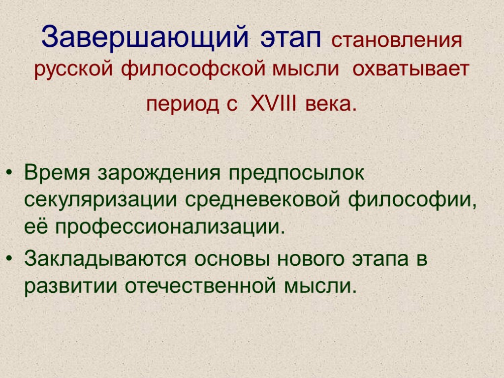 Завершающий этап становления русской философской мысли охватывает период с XVIII века. Время зарождения предпосылок секуляризации средневековой философии, её профессионализации. Закладываются основы нового этапа в развитии отечественной мысли.