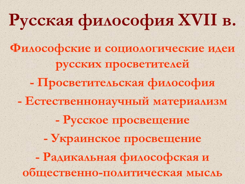 Русская философия XVII в. Философские и социологические идеи русских просветителей - Просветительская философия - Естественнонаучный материализм - Русское просвещение - Украинское просвещение - Радикальная философская и общественно-политическая мысль