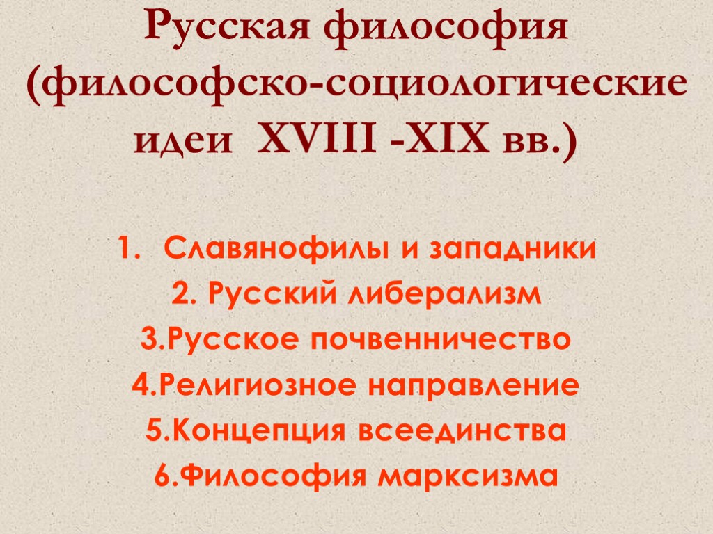 Русская философия (философско-социологические идеи XVIII -XIX вв.) Славянофилы и западники 2. Русский либерализм 3.Русское почвенничество 4.Религиозное направление 5.Концепция всеединства 6.Философия марксизма