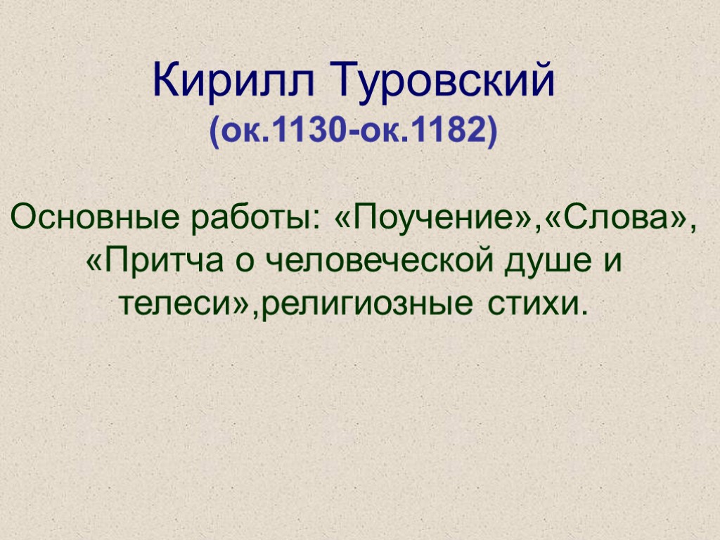 Кирилл Туровский (ок.1130-ок.1182) Основные работы: «Поучение»,«Слова», «Притча о человеческой душе и телеси»,религиозные стихи.