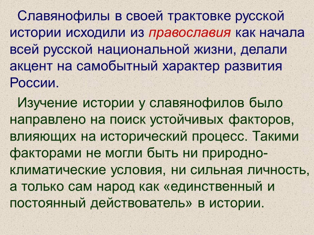 Славянофилы в своей трактовке русской истории исходили из православия как начала всей русской национальной жизни, делали акцент на самобытный характер развития России. Изучение истории у славянофилов было направлено на поиск устойчивых факторов, влияющих на исторический процесс. Такими факторами не могли быть ни природно-климатические условия, ни сильная личность, а только сам народ как «единственный и постоянный действователь» в истории.