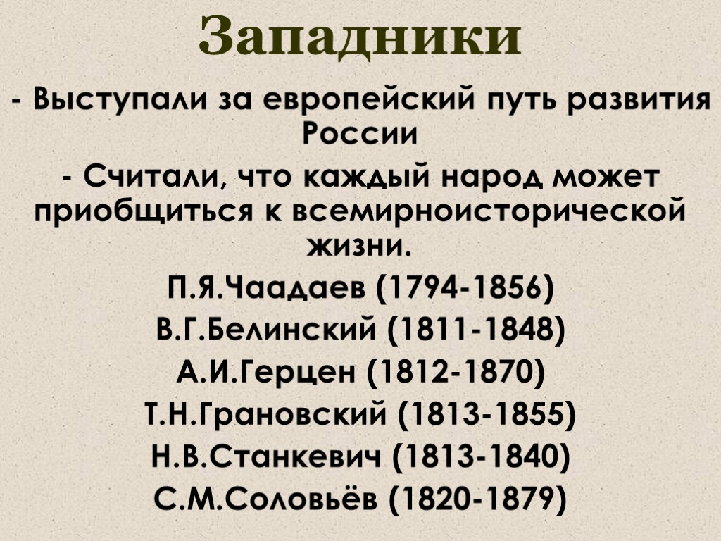 Западники - Выступали за европейский путь развития России - Считали, что каждый народ может приобщиться к всемирноисторической жизни. П.Я.Чаадаев (1794-1856) В.Г.Белинский (1811-1848) А.И.Герцен (1812-1870) Т.Н.Грановский (1813-1855) Н.В.Станкевич (1813-1840) С.М.Соловьёв (1820-1879)